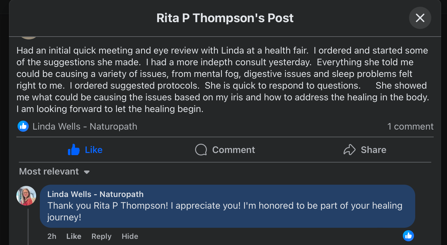 2.) Iridology - They Iris of your eye tells a story. It is the only place in the human body where you can see the nervous system from outside the body. The Iris can show the level of health or damage to any part of the body.